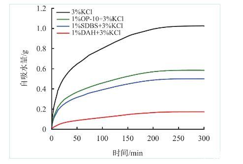 由圖5可以看出,水相會在毛細(xì)管力的作用下自吸入巖心,初始階段巖心的自吸水量較大,經(jīng)過200 min后達到平衡,自吸水量不再增加;加入DAH后,巖心自吸水量下降83.1%,且相較于常用防水鎖劑OP-10、SDBS效果更佳。圖6同樣表明,加入DAH后,巖心自吸水速率大幅降低,整個自吸過程中速率緩慢。上述實驗表明,DAH可以減少因毛細(xì)管力被吸入地層的水相,從而降低水鎖損害發(fā)生的風(fēng)險。
