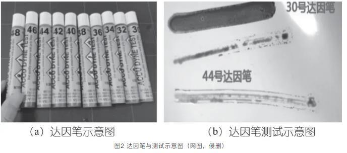 測試前先確定環(huán)境溫度、空氣濕度、以及被測物體表面溫度是否達到達因筆標定的標準條件(溫差越大,測量誤差越大)。測試方法圖2(b)所示塑料袋張力測試,當30mN/m筆測試時,在2 s內(nèi)達因筆潤濕了基材表面,沒有收縮或分散情況,說明表面張力等于或大于30 mN/m;當44 mN/m筆測試時,在2 s內(nèi)達因筆沒有潤濕了基材表面,出現(xiàn)收縮或分散水珠情況,說明表面張力小于44 mN/m。還可用大于30 mN/m筆測量,以此類推,直到測試結(jié)果在2 s內(nèi)改縮成水珠(球狀),則這測試之前一次的值被視為基材表面能,并作比較用。塑料袋PP材質(zhì)在溫度20℃時表面張力是31~33 mN/m。達因筆使用方便,保質(zhì)期為6個月。