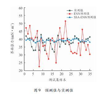 圖9給出了以140組樣本為訓練集對ENN和SSAENN預測模型進行訓練后,其余未參加訓練的35組樣本的界面張力預測值。與測試集的界面張力實測值相比,ENN預測模型的預測值整體差值較大,預測差值最大為14.58mN/m,最小為1.38mN/m;SSAENN預測模型的整體預測差值較小,個別變壓器油測試樣本的預測差值較大,預測差值最大為6.08mN/m.