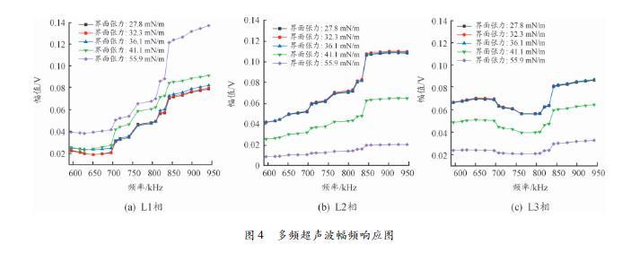 實驗共選取175組不同界面張力的變壓器油進行實驗。圖4為超聲波接收器接收到的三相信號的幅頻響應圖,所選取的5組變壓器油樣的界面張力值分別為27.8、32.3、36.1、41.1、55.9mN/m.