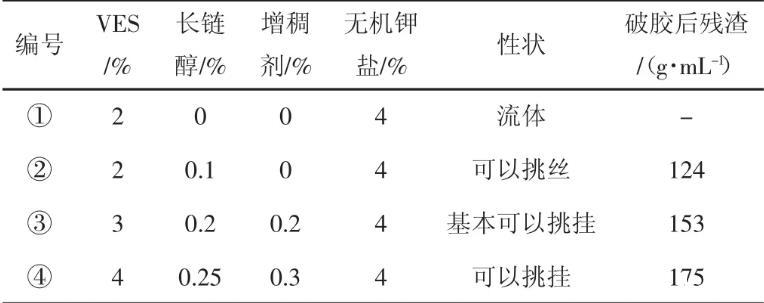 由表1可知④號(hào)配方當(dāng)VES的含量為4%,長鏈醇為0.25%,無機(jī)鉀鹽含量為4%,增稠劑含量為0.3%時(shí)可以挑掛且殘?jiān)可伲瑸樽罴训呐浔取L鸩藟A型陽離子清潔壓裂液的配方(見表2)。