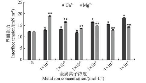 圖4 CaCl2及MgCl2濃度對油水界面張力的影響