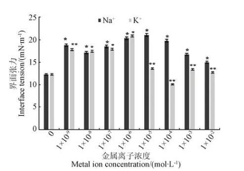 已有研究結(jié)果表明,電解質(zhì)的加入能使溶液內(nèi)部粒子之間的相互作用強于純水。因此,在一定濃度范圍內(nèi),電解質(zhì)的加入會使油/水溶液界面張力增大。本研究就Na+、K+離子對油水界面組成與結(jié)構(gòu)的影響進(jìn)行了驗證研究。如圖2所示,Na+、K+對界面張力的影響相似,對麥胚LA界面張力的影響隨其濃度的增加呈現(xiàn)先增加后降低的趨勢,但高濃度時K+對油水界面張力的影響不及Na+顯著(P<0.05)。當(dāng)離子濃度在1.0×10-9~1.0×10-6mol/L時,Na+、K+均可明顯提高界面張力。當(dāng)K+濃度高于1.0×10-5mol/L,麥胚LA的油水界面張力開始明顯降低。原因可能是高濃度無機鹽離子將影響麥胚LA在溶液界面上的聚集數(shù)量和穩(wěn)定性。由于麥胚LA具有類似于分子表面活性劑的性質(zhì),可以緊密吸附界面上,從而降低界面張力。