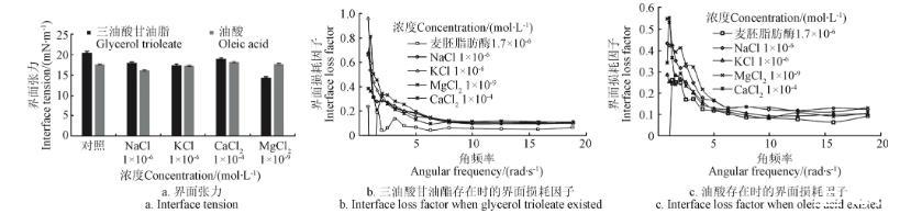 從圖8b和圖8c可以看出,三油酸甘油酯或油酸存在時,無機鹽對tanδ的影響規(guī)律性較差,出現(xiàn)上述情況的原因可能是因為無機鹽離子降低了麥胚LA在油水界面的溶解度,從而為三油酸甘油酯或油酸保留了更多的界面面積,有利于更多的三油酸甘油酯或油酸占據(jù)有效界面,以至于降低了底物或產(chǎn)物存在時的油水界面張力。
