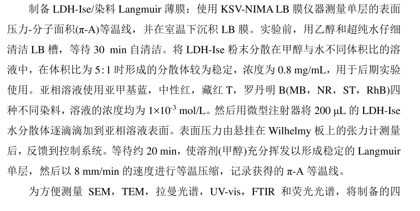 本研究利用共沉淀法、離子交換法和水熱合成法制備了功能化的LDH,通過超分子自組裝技術(shù)設(shè)計合成了幾種LDH/染料復(fù)合LB膜,并對LB膜的自組裝機理和性能進行探討。首先,使用LB技術(shù)合成了功能化二維鎂鋁水滑石(LDH-Ise)與亞甲基藍(MB)、中性紅(NR)、羅丹明B(RhB)、藏紅T(ST)四種染料自組裝的Langmuir復(fù)合膜,并對其組裝過程的多樣化和化學氣體傳感機理進行了探討。分析認為,LDH-Ise/染料LB復(fù)合膜中不同染料分子與LDH之間的各種協(xié)同作用促使染料在LDH表面產(chǎn)生不同行為的聚集。