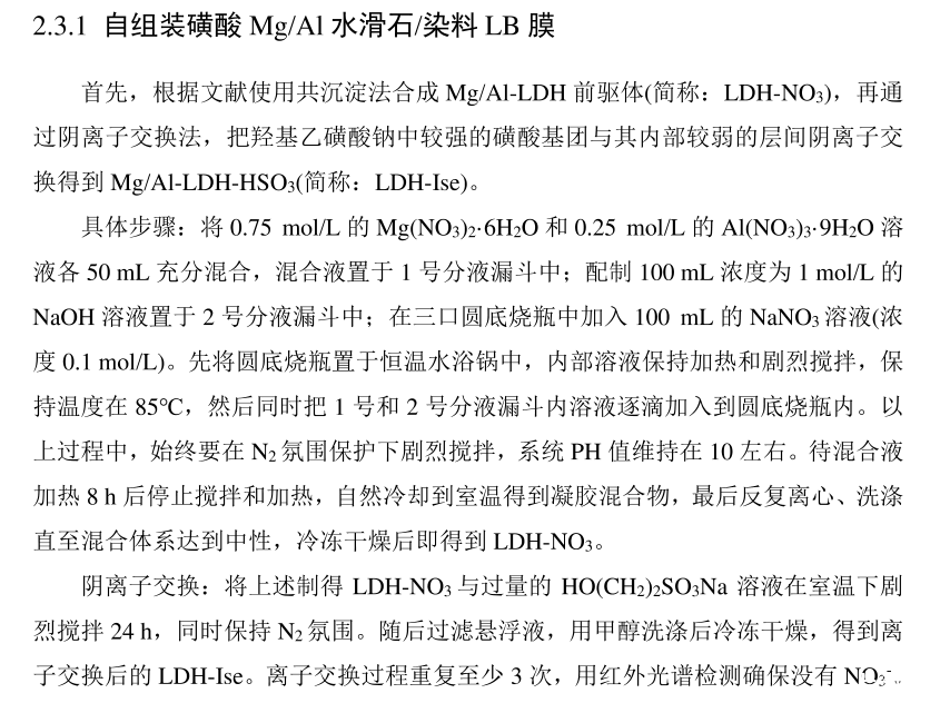 分子自組裝的基本過程是系統(tǒng)中的分子無序到有序聚集成納米尺度的聚集體,利用分子自組裝技術(shù)制備的功能化復(fù)合材料具有廣泛的應(yīng)用價值。水滑石(LDH)這類陰離子型層狀材料因結(jié)構(gòu)的特殊性,在催化、生物傳感、藥物儲存-遞送代理、電化學儲能等各種技術(shù)領(lǐng)域有廣泛應(yīng)用。近幾年研究發(fā)現(xiàn),在使用LDH粉體過程中,分散片層容易丟失還不易被回收。因此,用LDH分散片組裝制備新型功能薄膜材料成為現(xiàn)今研究的熱點問題。