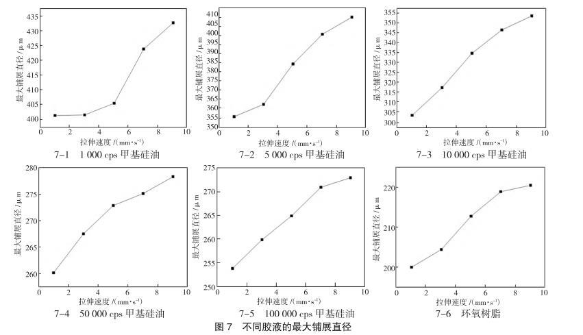 點膠結果最直觀的顯示就是形成膠斑達到穩定狀態時膠斑的直徑,因此對膠斑的直徑進行研究。選取5種表面張力相似黏度不同的甲基硅油以及黏度為10 000 cps的環氧樹脂作為實驗用膠。移液針抬升速度分別設置為1 mm/s,3 mm/s,5 mm/s,7 mm/s,9 mm/s。使用的移液針直徑為200μm。實驗結果如圖7所示。