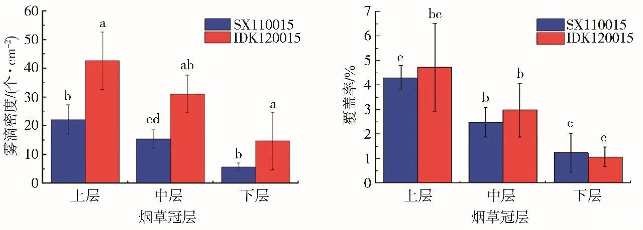 如圖4所示,與SX110015噴頭相比,IDK120015噴頭可提高藥液霧滴密度,煙草上、中、下冠層分別提高92.9%、101.6%和160.7%;在煙草上、中冠層藥液霧滴覆蓋率分別提高10.0%和20.2%,但在煙草下冠層藥液霧滴覆蓋率則降低13.8%。這是由于IDK120015噴頭孔徑小,藥液霧滴粒徑更細,而SX110015噴頭的噴霧藥液霧滴的穿透性更強。因此,在使用時應根據天氣條件和防治對象選擇合適類型的噴頭。