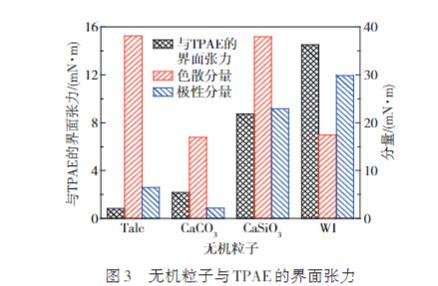 相比之下,CaSiO3與TPAE、WI與TPAE的界面張力分別達(dá)到8.72 mN/m和14.5 mN/m,大約為Talc的10~15倍,高界面張力通常導(dǎo)致物質(zhì)間的相分離,表明CaSiO3和WI與TPAE之間存在明顯的不相容。而CaCO3與TPAE的界面張力雖低于CaSiO3和WI,但仍高于Talc,表明CaCO3與TPAE的相容性位于中間。