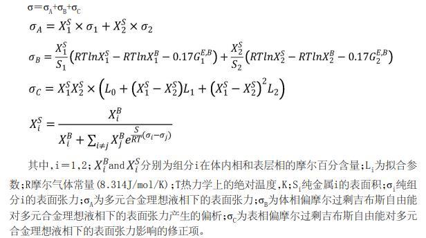 其中,i=1,2,3,……,n;and分別為組分i在體內相和表層相的摩爾百分含量;R摩爾氣體常量(8.314J/mol/K);T熱力學上的絕對溫度,K;Si純金屬i的表面積;σi純組分i的表面張力;σA為多元合金理想液相下的表面張力;σB為體相偏摩爾過剩吉布斯自由能對多元合金理想液相下的表面張力產生的偏析;σC為表相偏摩爾過剩吉布斯自由能對多元合金理想液相下的表面張力影響的修正項。