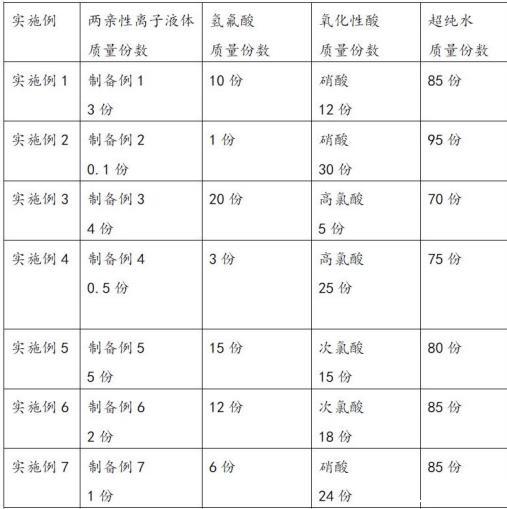 多晶硅蝕刻液實施例1-7包含的組分及摩爾比如表1所示,多晶硅蝕刻液對比例1-3包含的組分及摩爾比如表2所示。按照下表1和表2分別稱取各自用量的各個組分,然后將超純水、氫氟酸、氧化性酸、兩親性離子液體依次加入容器內,充分攪拌溶解,最后采用0.5μm濾芯過濾,即得所述多晶硅蝕刻液。