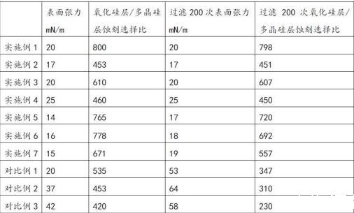 采用上述方法處理完成后,采用芬蘭Kibron公司生產的表面張力儀在室溫下分別對蝕刻液和經過0.5μm的濾芯過濾200次后的蝕刻液的表面張力進行測試,測試結果參見表3。