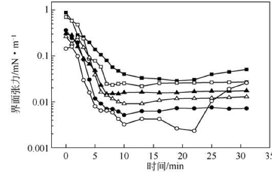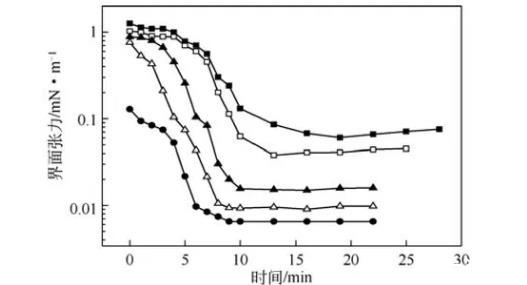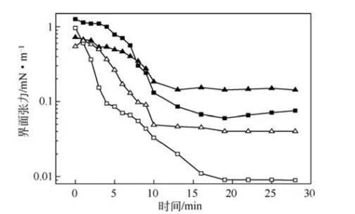 圖7不同助劑對復配體系油/水動態界面張力的影響