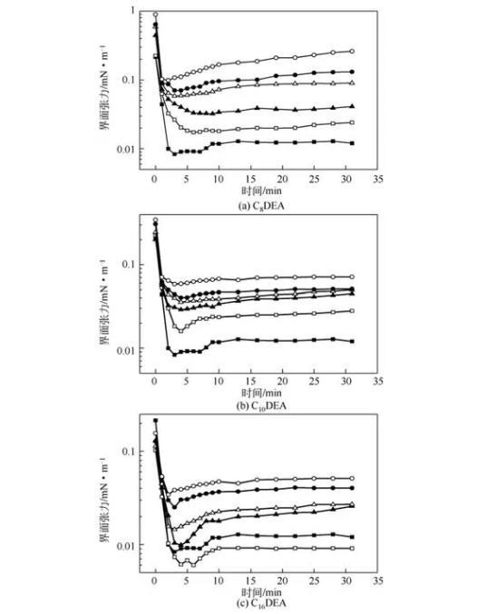 圖4 C8 DEA、C10 DEA、C16 DEA對C12 DEA/C14 DEA復配體系油/水動態界面張力的影響