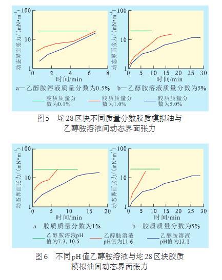 ZhangL等曾對勝利油區孤東油田外輸油中的酸性組分按相對分子質量和極性細分,研究發現:對于相對分子質量較低的脂肪酸,弱堿條件下就能夠發生反應,大幅度降低界面張力瞬時值,但穩態值較高,動態界面張力曲線呈“V”型,油酸模擬油的動態界面張力特性就是典型代表;而對于相對分子質量較高、含稠環的芳香酸,則只能與強堿發生反應,生成的芳香酸皂水溶性較弱,傾向于吸附在界面上,因此,動態界面張力不再出現極小值。坨28區塊原油的酸性組分是混合酸,其中不同結構的石油酸可能在不同pH值條件下分別起主導作用:低質量分數的乙醇胺溶液主要與低相對分子質量的脂肪酸作用,而高質量分數的乙醇胺溶液主要與高相對分子質量的芳香酸作用。