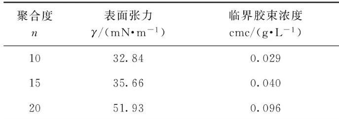 (2)聚乙二醇聚合度n=10、15、20時,產品表面張力依次為32.84 mN/m、35.66 mN/m、51.93 mN/m,臨界膠束濃度為0.029 g/L、0.040 g/L、0.096 g/L,HLB為12.84、14.9、15.14,濁點為20℃、61℃、71℃,潤濕時間為640 s、839 s、865 s,乳化時間為1063 s、1036 s、706 s.與傳統的表面活性劑相比,所合成的非離子雙子表面活性劑的表面張力和臨界膠束濃度均較小,乳化性能和潤濕性能均較好,可作為水包油型乳化劑使用。