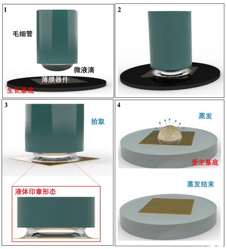 針對當前轉印技術中存在的問題,研究人員結合接觸式和非接觸式轉印的特點,提出了一種基于表面張力的液滴轉印方法,利用液體的流變特性,通過毛細管對液滴形態的控制,調控固-液界面的粘附力,從而實現柔性器件的轉印,該方法減少了超薄柔性器件的轉印過程中印章對器件的損傷,同時也為曲面電子器件的制造提供了新的思路。