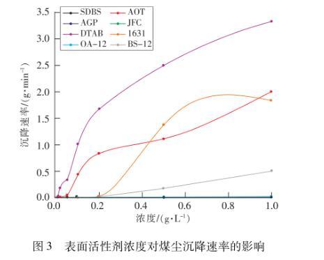 從表4和圖3可以看到,在0.000 1~1 g/L的濃度范圍內,煤塵的沉降時間隨表面活性劑濃度的增大而減小,沉降速率則隨濃度的增大而增大。當濃度小于0.005 g/L時,煤塵在8種表面活性劑溶液中的沉降時間均大于1 h,沉降速率接近于0,在溶液表面會形成一層黑色的“膜”,煤塵無法沉降。隨著表面活性劑溶液濃度增大,煤塵的沉降時間將會縮短,速率會增大,當濃度超過臨界膠束濃度后,溶液表面張力隨濃度增加不再改變,但沉降時間會繼續縮短,沉降速率會繼續增大,這可能是由于煙煤的煤塵具有較大的比表面積和孔隙率,表面活性劑濃度的增大,更多的表面活性劑分子有機會吸附于煤塵上,加快了煤塵沉降。陰離子和非離子表面活性劑的溶液濃度對潤濕煤塵作用的影響較大,當表面活性劑濃度從0.1 g/L增大到0.2 g/L時,煤塵在SDBS和JFC中的沉降時間分別從58.17 min和22.75 min迅速降至7.3 min和4.73 min;當表面活性劑濃度從0.005 g/L增大到0.05 g/L時,煤塵在AOT和APG的沉降速率分別從0002 2 g/min和0.002 5 g/min迅速增至005 g/min和0.33 g/min。而在0.000 1~1.0 g/L的實驗濃度區間內,濃度對陽離子和兩性型表面活性劑潤濕煤塵作用的影響都較小,潤濕煤塵效果較差。SDBS,AOT,APG和JFC4種表面活性劑濃度分別達到0.5,0.1,0.02和0.5 g/L時,煤塵在溶液中的沉降時間小于1 min,速率大于1.0 g/min,煤塵效果好。