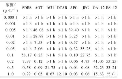 2)表面活性劑溶液的表面張力與其自身性質及濃度密切相關。8種表面活性劑溶液表面張力隨濃度的增大先減小后在臨界膠束濃度附近穩定,其表面張力均遠小于水的表面張力。因8種表面活性劑的性質不同,臨界膠束濃度值和表面張力值分別在0.04~053 g/L和25.61~34.79 mN/m之間差異較大。8種表面活性劑按降低溶液表面張力的能力由強到弱排序為:APG>AOT>JFC>SDBS>OA-12>BS-12>1631>CTAB,非離子>陰離子>兩性型>陽離子。非離子表面活性劑APG形成膠束和降低表面張力能力均為最佳,其臨界膠束濃度為0.04 g/L,表面張力為25.61 mN/m。
