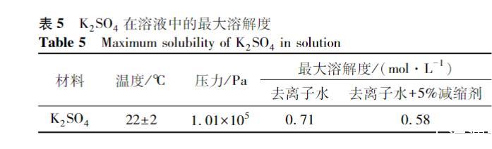 表5列出了K2SO4的最大溶解度。結(jié)果表明,SRA確實(shí)會(huì)降低K2SO4的最大溶解度。但是,對(duì)比圖5可以發(fā)現(xiàn),漿體孔溶液中的K+和SO42-的濃度還遠(yuǎn)遠(yuǎn)未達(dá)到K2SO4的最大溶解度。因此,并不能依據(jù)SRA會(huì)降低K2SO4最大溶解度的結(jié)果判定這是B組溶液中SO42-濃度低的原因,還需要研究K2SO4在SRA中的溶解速度。
