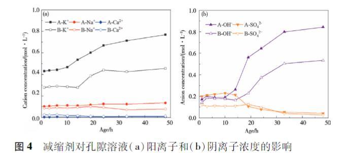圖4減縮劑對(duì)孔隙溶液(a)陽(yáng)離子和(b)陰離子濃度的影響