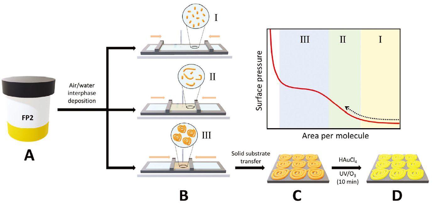 證明了病毒融合肽序列在朗繆爾槽內從納米原纖維形成彈性螺旋狀結構的卓越能力。此外通過控制空氣-水界面的壓縮力,獲得了具有特定曲率和纖維間距離的納米原纖維。單軸壓縮也證明了流體到固體的轉變,導致凝膠網絡的形成,如剪切流變學所證明的那樣。這里介紹的制造方法引入了單軸收縮方法,作為制造高度均勻的肽纖維單層并將其轉移到固體基質上的穩健而有效的方法。最后螺旋狀結構用作制造金金屬復制品的模板。這種多技術方法不僅加深了對肽自組裝的理解,而且揭示了工程功能納米材料的新場景。