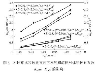 兩相流速、相比與傳質方向對體積傳質系數的影響見圖6。圖中結果顯示:分別用有機相溶質濃度和水相溶質濃度表示傳質推動力得到的體積傳質系數Koda和Koca隨著連續相流速的增加而增大,傳質方向相同(d→c)時,高相比的體積傳質系數(Koda或Koca)大于低相比的體積傳質系數。其原因主要還在于高流速和高相比的情況下,傳質相界面積a更大。