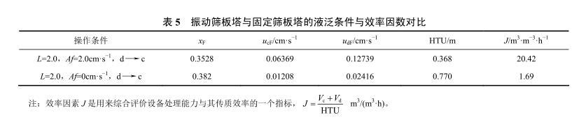 表5振動篩板塔與固定篩板塔的液泛條件與效率因數對比