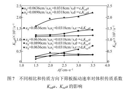圖7不同相比和傳質方向下篩板振動速率對體積傳質系數Koda、Koca的影響