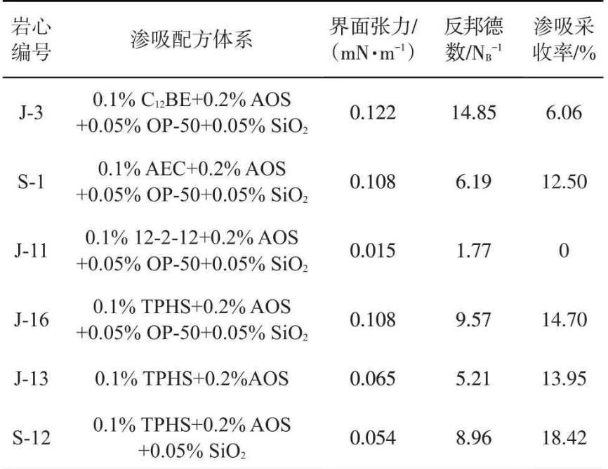 為驗(yàn)證TPHS活性納米流體在滲吸采收率的應(yīng)用,采用靜態(tài)滲吸實(shí)驗(yàn)開展TPHS及常見表面活性劑復(fù)配溶液滲吸效果對比研究,巖心的基本物性參數(shù)見表2,不同體系與原油間的界面張力、所計算的反邦德數(shù)和滲吸采收率結(jié)果見表3,結(jié)果表明在滲吸過程中毛管力起主導(dǎo)作用。