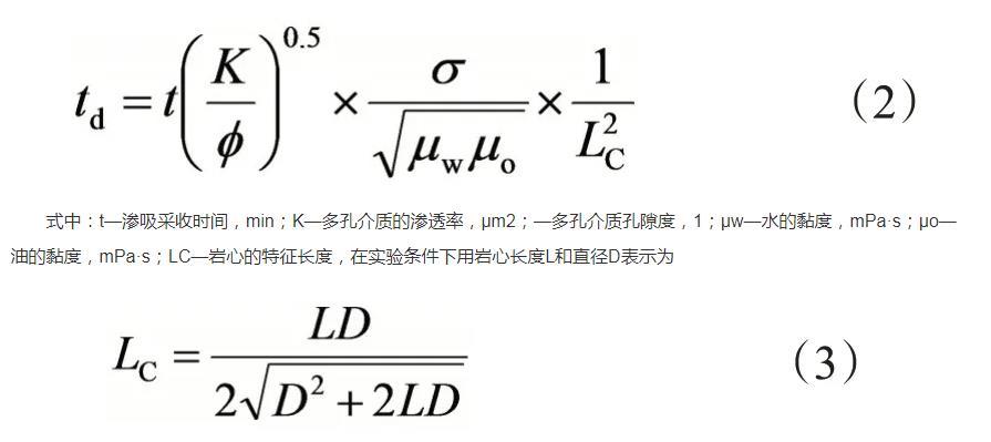 式中:t—滲吸采收時間,min;K—多孔介質(zhì)的滲透率,μm2;—多孔介質(zhì)孔隙度,1;μw—水的黏度,mPa·s;μo—油的黏度,mPa·s;LC—巖心的特征長度,在實(shí)驗(yàn)條件下用巖心長度L和直徑D表示為