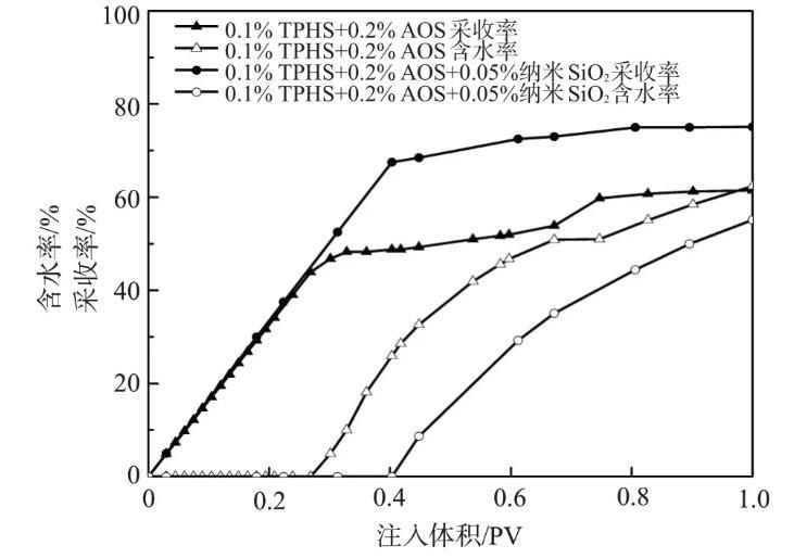 少量納米SiO2顆粒與TPHS、AOS復(fù)配即可產(chǎn)生潤濕協(xié)同作用,提高滲吸速率和采收率,并能形成乳液穩(wěn)定油墻,延長無水采油期。