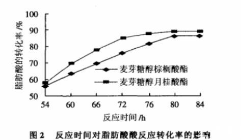 綜合上述實驗結(jié)果,以脂肪酶Novozym 435為催化劑,用量為0.24g/mmol脂肪酸,脂肪酸用量為1mmol,麥芽糖醇用量為2.0mmol,溶劑用量為10mL,在60℃條件下反應80h,棕櫚酸和月桂酸的轉(zhuǎn)化率分別達91%和95%。該結(jié)果是本實驗條件范圍內(nèi)的最好結(jié)果。
