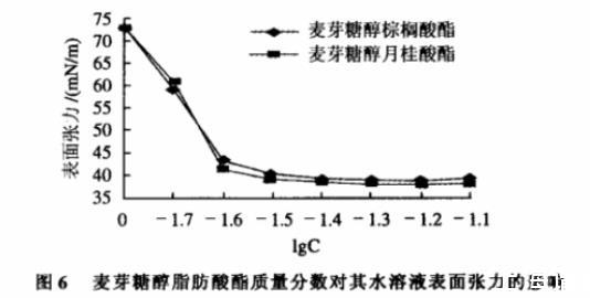由圖6可見,麥芽糖醇脂肪酸酯對水溶液的表明張力降低明顯。當麥芽糖醇脂肪酸酯水溶液質(zhì)量分數(shù)0.04%時,就可以使水溶液的表明張力降低30mN/m。當麥芽糖醇脂肪酸酯水溶液的質(zhì)量分數(shù)為0.06%時,可以使水溶液的表明張力降低至38~40mN/m,與蔗糖脂肪酸酯(30~46mN/m)相近,說明麥芽糖醇脂肪酸酯具有較好的表面活性作用。