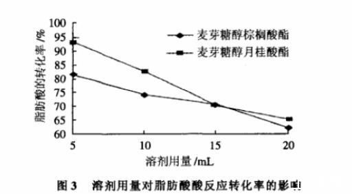 在麥芽糖醇用量為1.0mmol、脂肪酸用量0.5mmol、脂肪酶Novozym 435用量為0.15g,60℃反應72h的條件下,考察改變?nèi)軇┍昧繉Ψ磻挠绊懀Y(jié)果如圖3所示。