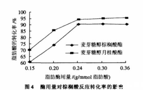 由圖4可見,在本實驗條件下,當酶的用量增加時,脂肪酸的反應轉(zhuǎn)化率增加。當酶的用量為0.24g/mmol脂肪酸時,催化效果最好,棕櫚酸及月桂酸的反應轉(zhuǎn)化率分別為達到90.6%和94.3%。