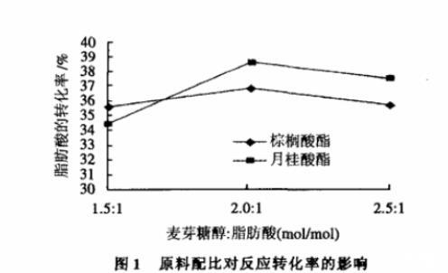 由圖1可知,在原料配比麥芽糖醇:脂肪酸酸分別使用1.5:1、2:1、2.5:1進行反應時,麥芽糖醇:脂肪酸為2:1時,脂肪酸的反應轉(zhuǎn)化率是最好的,但是,結(jié)果相差不大。即在本實驗條件下原料配比對反應的影響較小。分析原因,是因為麥芽糖醇和脂肪酸為互不相溶體系,在反應中,用丙酮做溶劑,即使能建立一個均相的反應體系,由于麥芽糖醇在丙酮中的溶解度比較小,溶液中隨麥芽糖醇的量增加而改變不大。而當麥芽糖醇達到一定用量后,會破壞原有的平衡,導致脂肪酸反應的轉(zhuǎn)化率降低。所以,反應中選擇麥芽糖醇:脂肪酸的配比為2:1為反應的最佳配比。