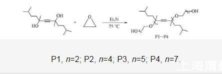 4種表面活性劑的合成條件相同,以P1的合成為例。首先將450 g(1.77 mol)2,5,8,11-四甲基~6-十二炔~5,8-二醇加入到高壓反應釜中,用高純氮氣置換釜內氣體3次;隨后加入3.65 g(0.036 mol)三乙胺,升溫至75℃后勻速通入316 g(7.18 mol)環氧乙烷,并持續反應3.5 h;反應完成后,將反應釜冷卻至室溫,打開反應釜閥門將殘余的環氧乙烷排放至尾氣吸收裝置,收集粗產物;通過旋轉蒸發儀除去粗產物中的三乙胺,得到739 g淡黃色液體,產率為96.5%.P2,P3和P4的合成步驟與表征見本文支持信息圖S1——S4.