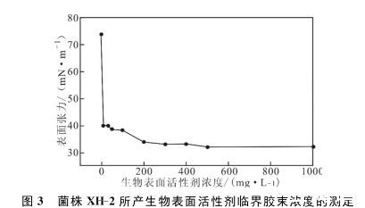菌株XH-2所產(chǎn)生物表面活性劑具有溫度、pH值和鹽度穩(wěn)定性,其臨界膠束濃度為200 mg·L-1,明顯低于常用的化學(xué)表面活性劑,具有良好的工業(yè)應(yīng)用價(jià)值。