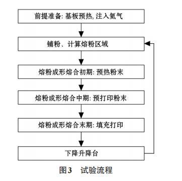 的當量直徑,μm;ni為當量直徑為di的顆粒的個數。計算可知,試驗粉末的算術平均直徑為65μm。再取100 mL的試驗粉料稱重,凈重為0.40 kg;計算得到試驗粉末體積孔隙率ε為0.49,因此粉末顆粒并非最緊密堆積狀態。熔粉制備了橫截面積為5 cm2,長5 cm的圓棒,每層鋪粉0.10 mm,實驗流程如圖3所示。