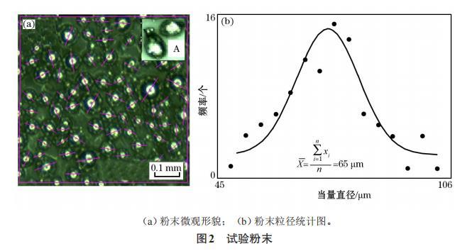 本文以不銹鋼316L(022Cr17Ni12Mo2)球粉為成形原料,顆粒直徑為45~106μm(如圖2所示)【316L不銹鋼的微觀組織:相鄰熔覆道之間的搭接良好。組織主要由胞狀晶和呈外延生長的柱狀晶組成,柱狀晶的取向各不相同。由于熔池邊界處粉末未熔化區域溫度較低,因此一部分晶粒沿著熔池邊界外延生長,同時在SLM過程中,熔池內部經歷快速冷卻,表面張力形成梯度,熔池內部存在“馬戈紊流”,熔池內發生對流,導致熔池內部散熱方向發生改變,因此,造成晶粒顯示出不同的生長方向。胞狀晶呈正六邊形,為柱狀晶的截面,柱狀晶晶粒十分細小,直徑分布在0.4~0.7μm。】,根據筆者已有的研究結果選擇合適的工藝,詮釋顆粒群的熔合線收縮和再結晶過程。由于試驗粉末顆粒直徑分布廣,為了建立粉末計算模型,用式(1)、(2)計算了顆粒群的當量直徑d和算術平均直徑d。