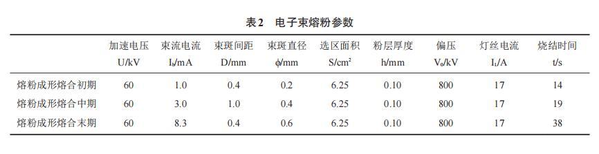 (1)試驗結果吻合熔粉理論模型,在熔合初期電子束預熱工藝下,離散的粉末微小粒徑的顆粒幾乎完全熔入大顆粒當中,且顆粒與顆粒之間呈凝聚態結構。