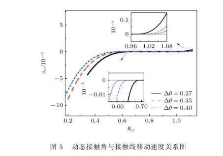 圖5比較了三種遲滯角下動態接觸角與接觸線移動速度間的對應關系.可以看出,遲滯角對鋪展、釘扎和去釘扎階段等全過程均有不同程度的影響,在釘扎階段,Δθ=0.27下的液滴前進接觸角和后退接觸角分別為θa=0.966和θr=0.696,Δθ=0.35和0.40下液滴對應于θa=0.997,θr=0.647和θa=1.016,θr=0.616.如表2所列,隨著遲滯角的增大,前進接觸角增大,后退接觸角減小,后退接觸角減小的幅度大于前進接觸角增大的幅度,這與Karapetsas等的研究結果一致.因此,可通過改變遲滯角來改變前進、后退接觸角,控制接觸線釘扎時間,從而調控液滴蒸發.