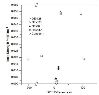 圖5 液滴穿透時間(DPT)的差異 鹽溶液和水,與鹽的離子強度 解決方案。