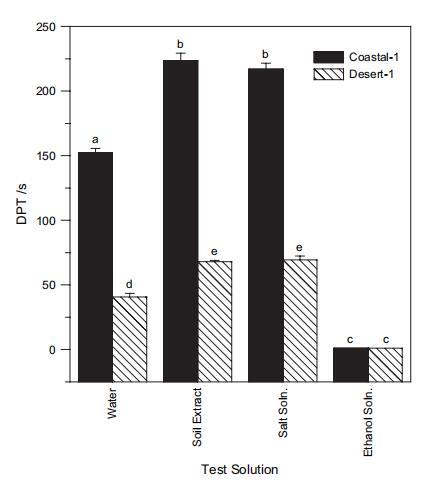 圖 4 水滴滲透時間 (DPT),2:1 w : w 2 小時 用于 Desert-1 和 沿海 1 土壤。 誤差棒顯示重復的標準偏差 滴。 小寫字母給出了兩側 t 檢驗的結果。 不同字母表示均值在 P ? 0.01 顯著性水平。