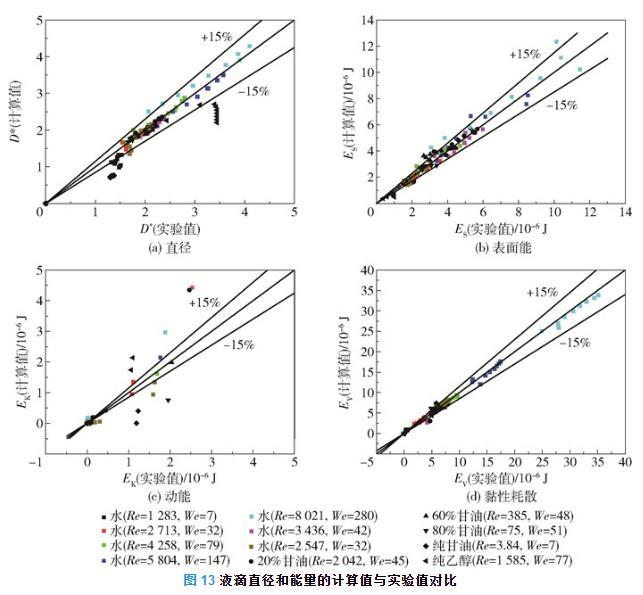 圖13為液滴直徑和能量的計算值與實驗值對比??梢钥闯?,液滴直徑的計算值和實驗值的平均誤差約為15%(圖13(a)),液滴表面能的計算值和實驗值的平均誤差約為15%(圖13(b)),液滴動能的計算值和實驗值的誤差較大,最大誤差約為50%(圖13(c)),液滴黏性耗散的計算值和實驗值的誤差小于15%(圖13(d))。