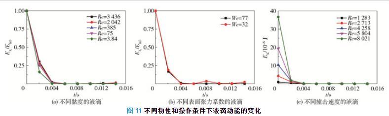 圖11(b)為水和乙醇液滴在撞擊過程中動能隨時間的變化??梢钥闯觯旱卧阡佌惯^程中動能的減小量和減小的速率不隨表面張力系數而變化。