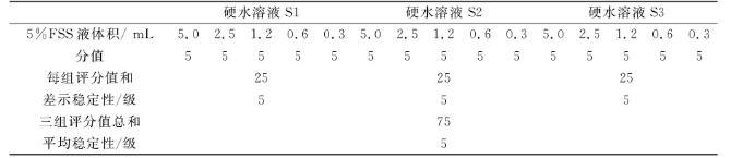 由表3知,F(xiàn)SS在硬水中的評分總和為75,可得出氟硅表面活性劑FSS的平均穩(wěn)定性為5級,另外,F(xiàn)SS在硬水中的每組評分值和均為25,從差示穩(wěn)定性評分標準可知,F(xiàn)SS的差示穩(wěn)定性也為5級。綜合評定分析表明:FSS在硬水中的穩(wěn)定性很好。
