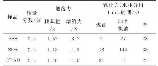 增溶力和乳化力也是表面活性劑的重要性能指標,表2列出了FSS的乳化力和增溶力測試結(jié)果,并與SDS、CTAB的性能進行對比。