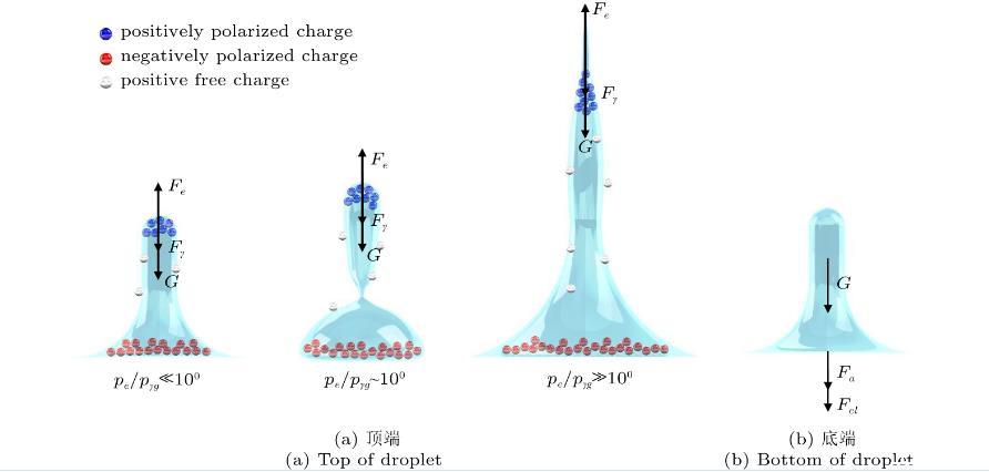 圖4(a)為液滴頂端所受力的方向和液滴整體電荷分布。液滴接觸下極板后,由于離子遷移和極化電荷的產生,中性液滴立即極化,其頂部帶正電荷,底部帶負電荷。根據庫倫定律,電場方向垂直向上,作用在液滴頂部的靜電力Fe是向上的,與電場方向相同,使液滴不斷向上拉伸,液滴拉伸高度增加,而表面張力Fγ和重力G使液滴向下收縮。基于上述的分析,各個模態的產生機理均可通過靜電力、表面張力和重力三者間的博弈關系來分析。三種作用力對液滴的影響大小可用局部靜電應力pe、毛細應力pγ和重力應力pg來表示。靜電力的大小由麥克斯韋應力張量T的散度給出,可表示為